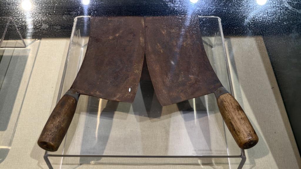 湘鄂西苏区革命历史馆里展示贺龙元帅刀劈芭茅溪盐局的两把菜刀。 记者 王洛伊 图