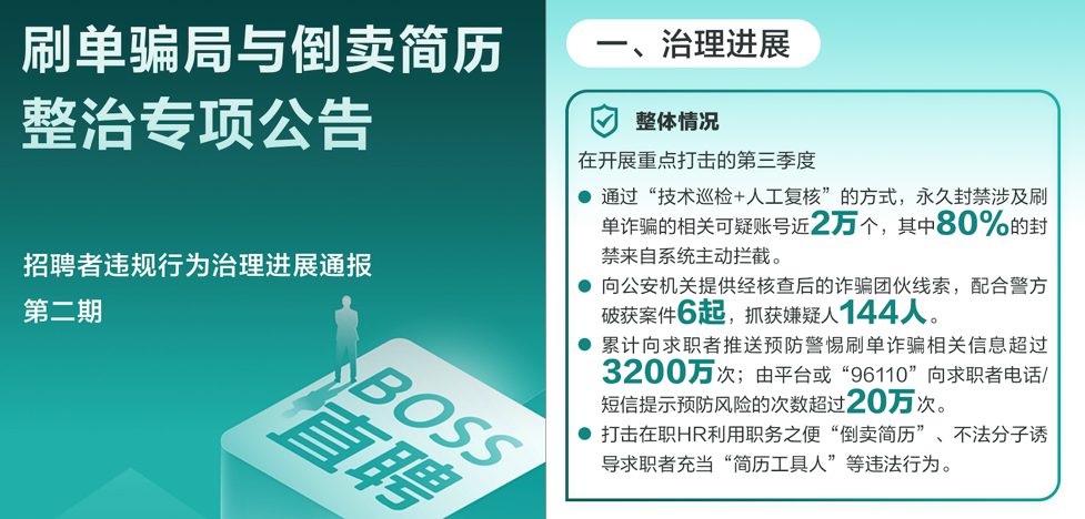10月29日,BOSS直聘发布《刷单骗局与倒卖简历整治专项公告》,披露了针对诱导求职者参与“网络刷单”、骗取钱款及倒卖简历等违法行为的治理进展与典型违法案例。