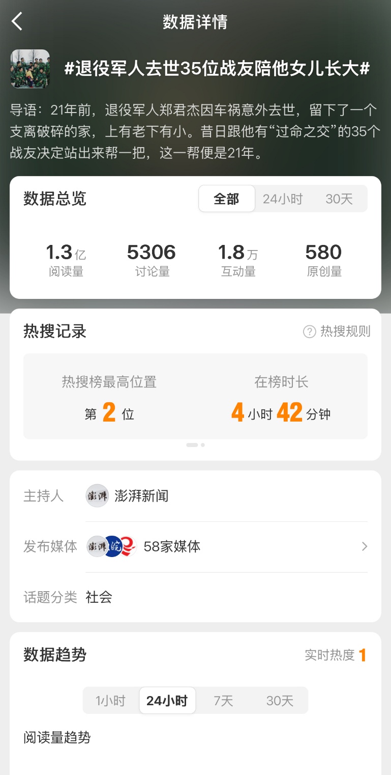 仅以“退役军人去世后,35位战友陪他女儿长大”为例,该报道刊发当天就登上了微博热搜榜第二,截至报道发布次日10月22日中午12时,话题总阅读量达1.3亿,多达56家媒体接力转发报道。《人心,不凉》专题报道有效凝聚了社会善意,为构建积极健康的社会心态提供了正向的情感纽带,这与旨在“让正能量澎湃大流量”的追求相契合。