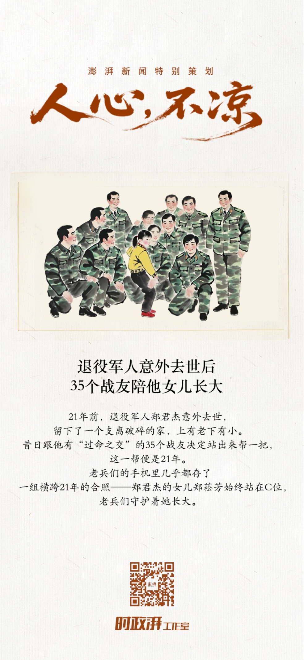——一位身为独生子的战友意外离去,其他35位和他有“过命之交”的战友接过了守护其女儿的重任,这一守护已持续了21年。这种默默的守护行为亦是一种“英雄之举”,不计名誉,不计得失。英雄之举不仅在关键历史时刻,亦在生活点滴之间。