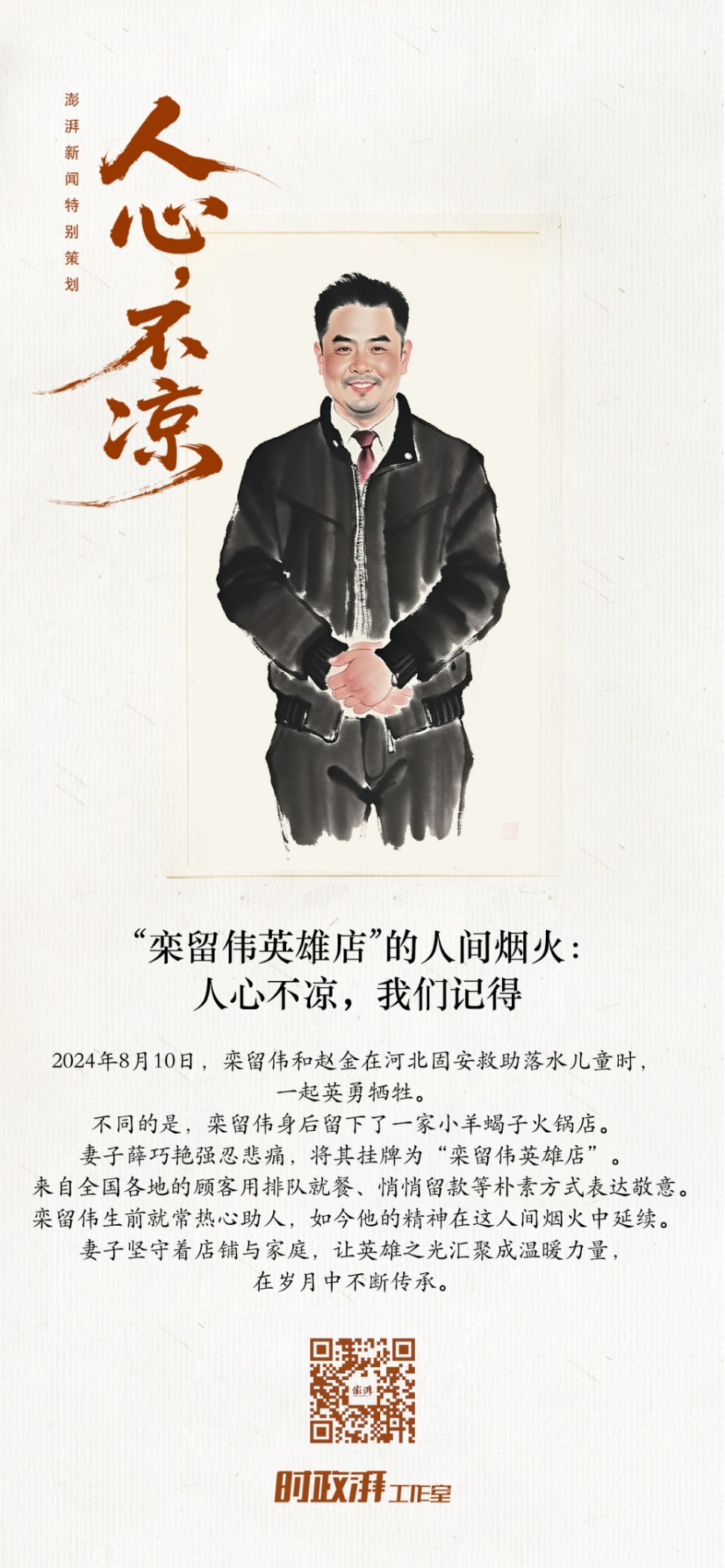 ——2024年8月10日,栾留伟和赵金在河北固安救助落水儿童时,一起英勇牺牲。不同的是,栾留伟身后留下了一家小羊蝎子火锅店。妻子薛巧艳强忍悲痛,将其挂牌为“栾留伟英雄店”。来自全国各地的顾客用排队就餐、悄悄留款等朴素方式表达敬意。栾留伟生前就常热心助人,如今他的精神在这人间烟火中延续。妻子坚守着店铺与家庭,让英雄之光汇聚成温暖力量,在岁月中不断传承。