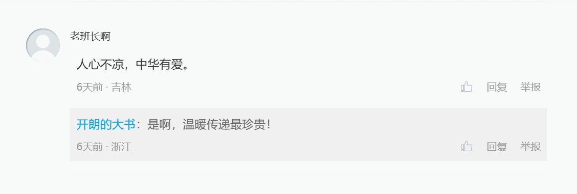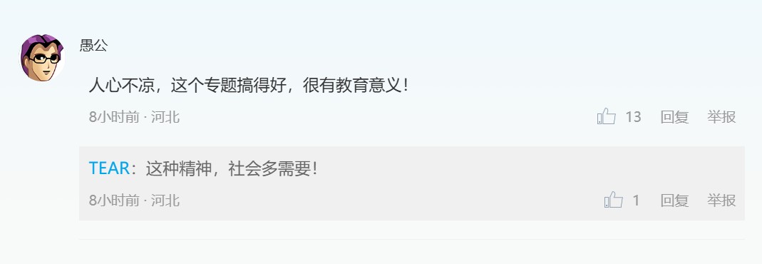 网友说,“人心不凉,这个专题搞得好,很有教育意义!”网友还说:“平凡的英雄,值得铭记。”还有网友说:“人心不凉,中华有爱。”