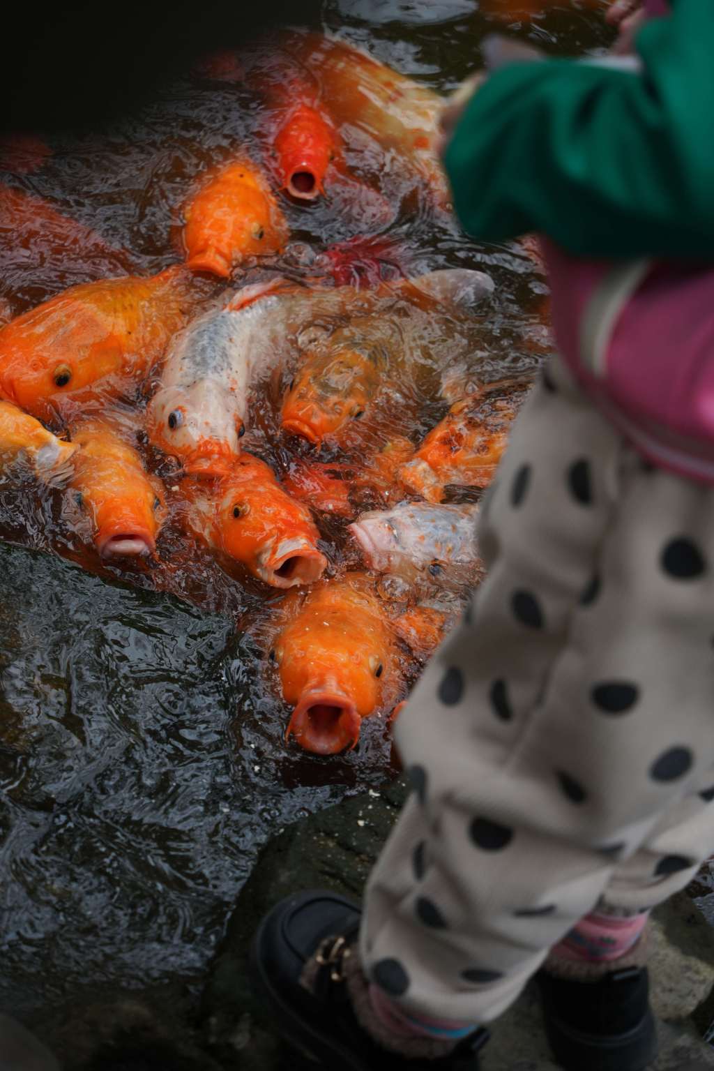 我再以陆元敏的两张进行分析,一张拍摄于南京路步行街,小女孩隔着玻璃为前景,她在观望底下密密麻麻的人群,画面传递出来的是生活的况味。除了控制好景深之外,拍摄几乎没有技巧可言。另一张,一群鱼儿张嘴露出水面讨要食物的画面,与前景小女孩裤子上斑斑点点的形成互文。普遍意义上,鱼儿在这里被视为是欢愉的象征,当然也可以被看作摄影师通过鱼儿的姿态,投射出我们自身在某一刻的生命姿态。这么说,摄影可能变得简单,甚至更为复杂了。简单的是,艺术作为一种人类高级情感的东西,有心气的艺术家一定不会简单地去复制生活,他势必要挣扎跳脱出来,走向更深的精神世界;复杂的是,我们在现场看不见鱼儿,也看不见小女孩眺望汹涌的人群身姿,更无法想象在未来某一刻她也加入到这滚滚红尘中,起起伏伏。我们与这些“景和物”擦肩而过。这里我们不得不承认,人的感知力有强弱之分,当生活向我们开启它的真相之时,是秘而不宣,稍纵即逝的,它以摄影的“灵光”形式闪现出来。
