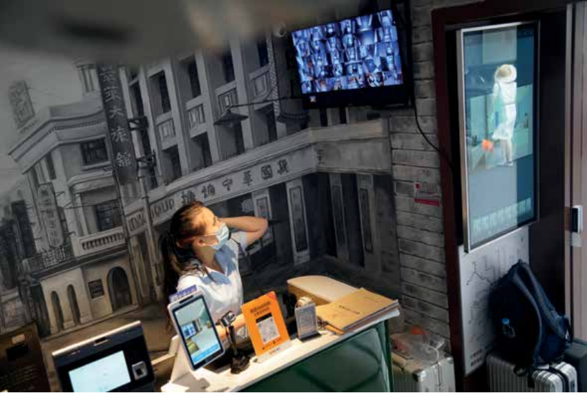 最后,我们来看看独立摄影评论家施瀚涛先生怎么解读陆元敏的作品。他说,“陆元敏用摄影重构了上海这座城市,同时为我们造了一个好梦。里面有你我的欢喜、伤感、泪水,也有遗憾以及憧憬。”施老师担心这样的表述过于抽象,不易理解。他拿出一张陆元敏拍摄的照片进行剖析,他说,“这张照片里包含了各种空间和对于当下非常具有象征意味的元素:过去的和当下的,身边的和远处的,日常的和异常的,数字的和现实的,管理的和被管理的。这些元素相互穿插叠加在一起,让人竟一时恍惚,不知身处何处。”