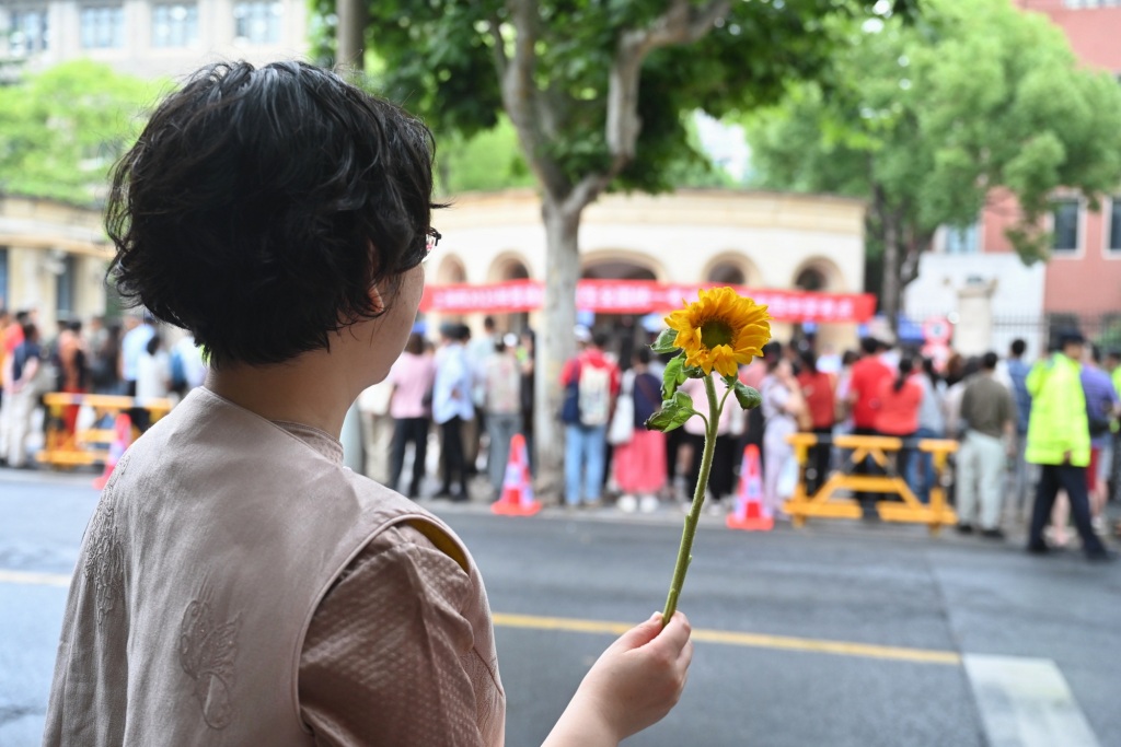 6月7日,在上海市西中学,家长手持向日葵给考生送考。记者 朱伟辉 图