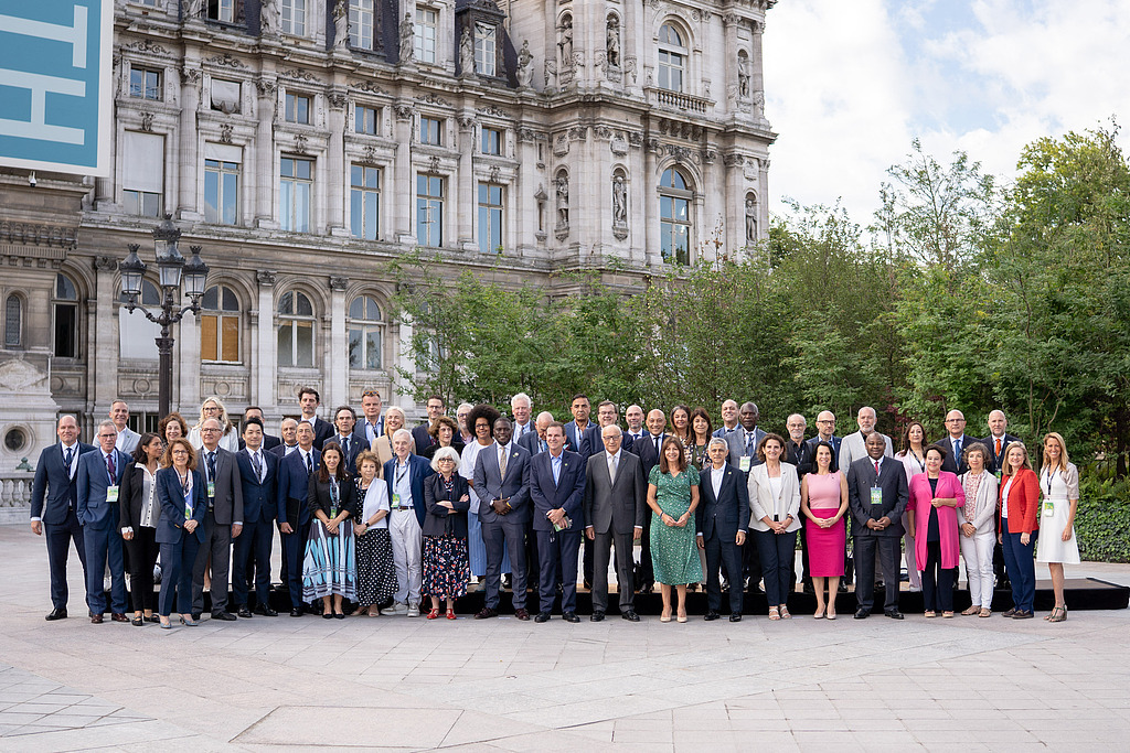 当地时间2025年6月23日,法国巴黎,巴黎市政厅外,巴黎市长安妮·伊达尔戈(前排绿衣)、伦敦市长萨迪克·汗、法国前总理洛朗·法比尤斯、欧盟委员会执行副主席特雷莎·里贝罗以及蒙特利尔市长瓦莱丽·普兰特与其他与会者合影,出席纪念《巴黎协定》签署十周年的市长峰会。视觉中国 资料图