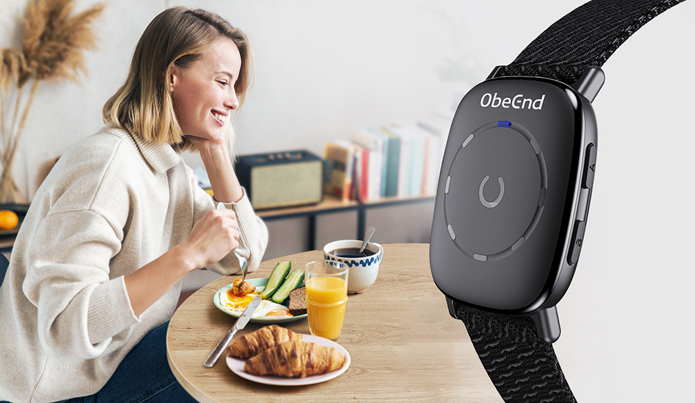 从外观来看,ObeEnd手环与普通运动手环并无太大区别,奥秘其实藏在手腕内侧的金属片上。戴上手环,手腕内侧立即能感受到轻微的电流感,表明手环正通过特定频率电流影响胃的活动。
