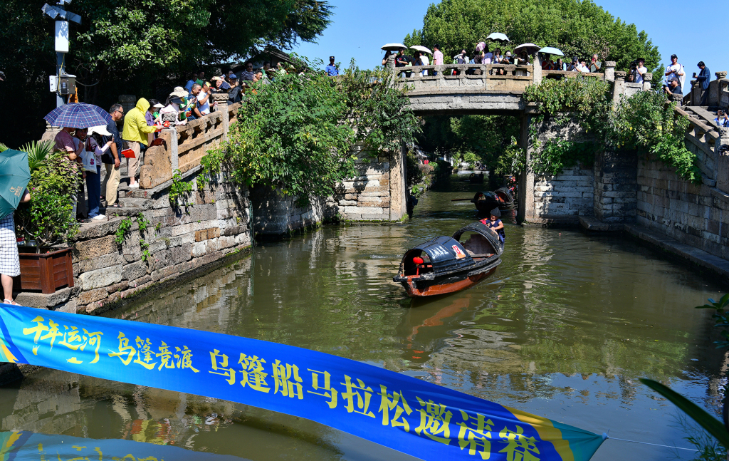 有着1000多年历史的乌篷船是绍兴独特的水上交通工具,有“水上巴士”之称。绍兴八字桥建于南宋期间,已有800多年历史,有“古代立交桥”之称。此次乌篷船马拉松大赛是水乡绍兴人为庆祝中华人民共和国成立76周年、庆贺大运河申遗成功十一周年而举办的一项活动。活动旨在以乌篷船为载体,通过“马拉松”赛的创新形式,充分展现绍兴大运河的秀丽风光和深厚文化底蕴,让更多游客领略绍兴水乡的历史文化底蕴和乌篷民俗风情魅力。