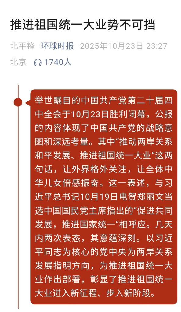 “北平锋”这篇评论10月25日晚9点许首发于《环球时报》微信公众号,很快就斩获了10万+的阅读量,亦可见其中彰显的民意与期待。网友留言说:“期待台湾统一的这一天。”网友留言说:“近了,近了,越来越近了!”网友还留言说:“两岸一定会统一!中华民族一定会更强大!两岸人民会过上更美好幸福的生活!”