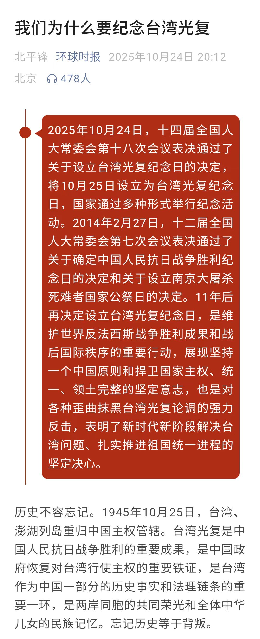 10月24日评论《我们为什么要纪念台湾光复》又进一步指出,设立台湾光复纪念日,是维护世界反法西斯战争胜利成果和战后国际秩序的重要行动,展现坚持一个中国原则和捍卫国家主权、统一、领土完整的坚定意志,也是对各种歪曲抹黑台湾光复论调的强力反击,表明了新时代新阶段解决台湾问题、扎实推进祖国统一进程的坚定决心。