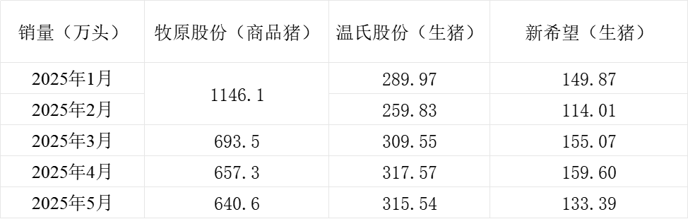 三大上市猪企牧原股份(002714.SZ)、新希望(000876.SZ)、温氏股份(300498.SZ)近日发布2025年5月生猪销售情况简报。