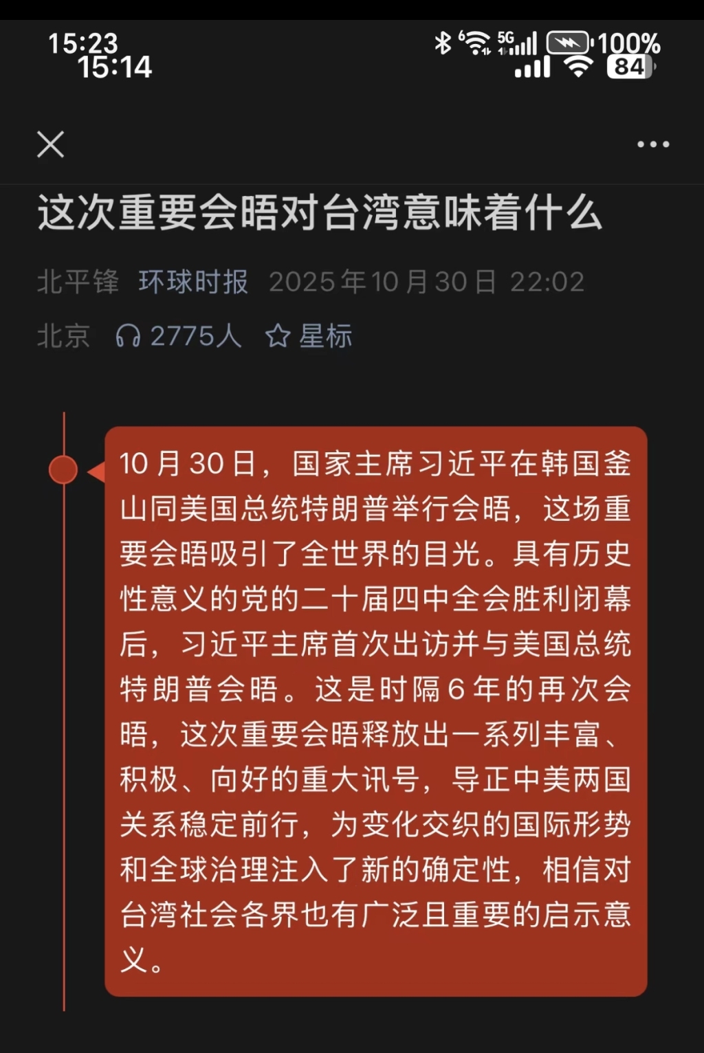 当晚10时许,“北平锋”刊发题为《这次重要会晤对台湾意味着什么》的文章。文章写道,具有历史性意义的党的二十届四中全会胜利闭幕后,习近平主席首次出访并与美国总统特朗普会晤。这是时隔6年的再次会晤,这次重要会晤释放出一系列丰富、积极、向好的重大讯号,导正中美两国关系稳定前行,为变化交织的国际形势和全球治理注入了新的确定性,相信对台湾社会各界也有广泛且重要的启示意义。