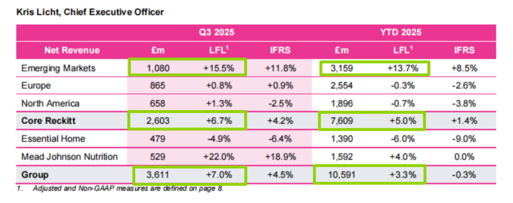 此次电话会上,利洁时全球管理层也多次提及中国市场。李开睿指出,中国市场已连续9个季度实现双位数增长,增长驱动因素包括创新能力突出,新品迭代与市场响应速度快;新品牌孵化与增长能力强,如茵缇玛品牌今年净收入翻倍。